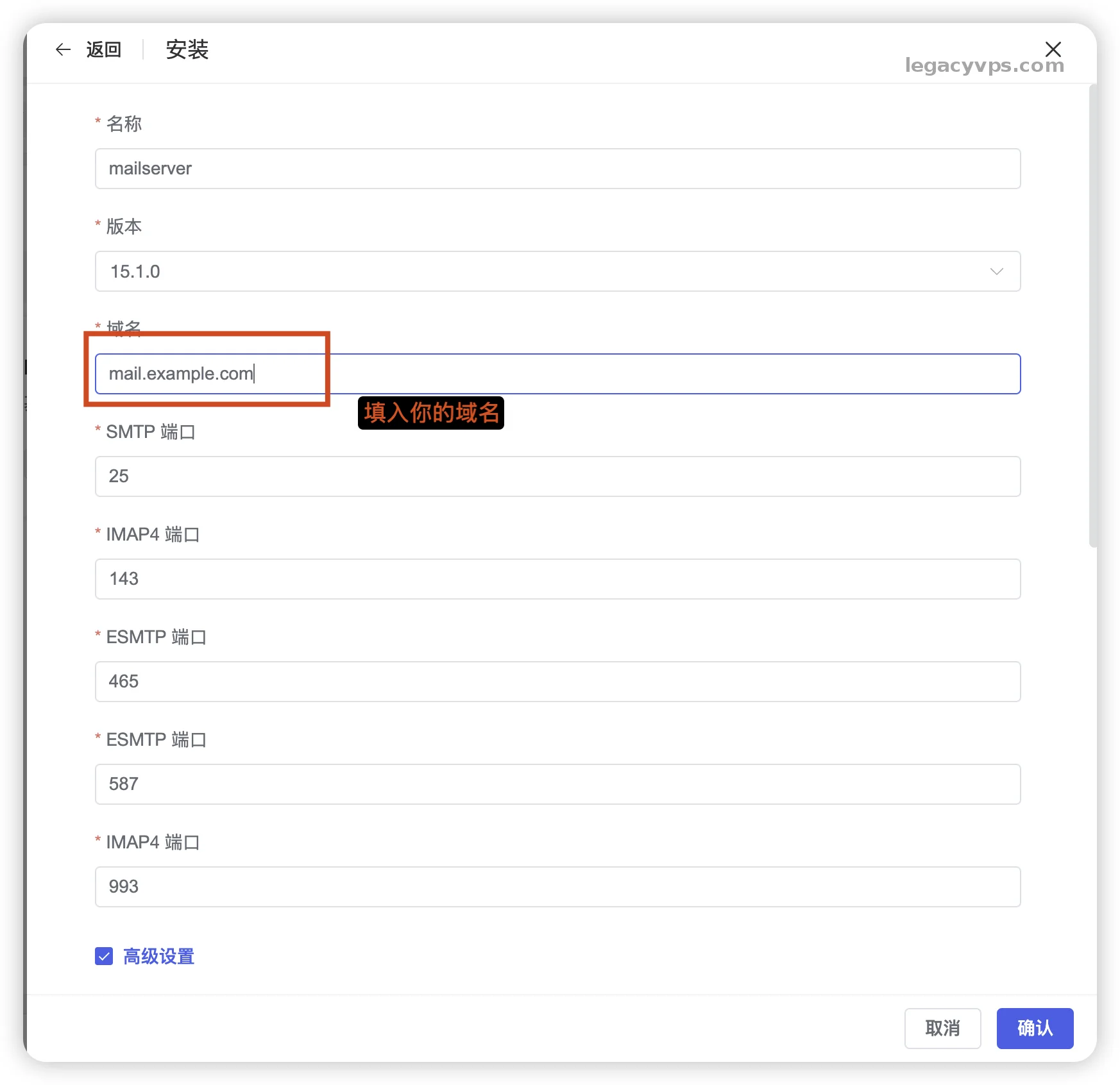 mailserver。OVERRIDE_HOSTNAME: 输入你的邮件服务器主机名,例如