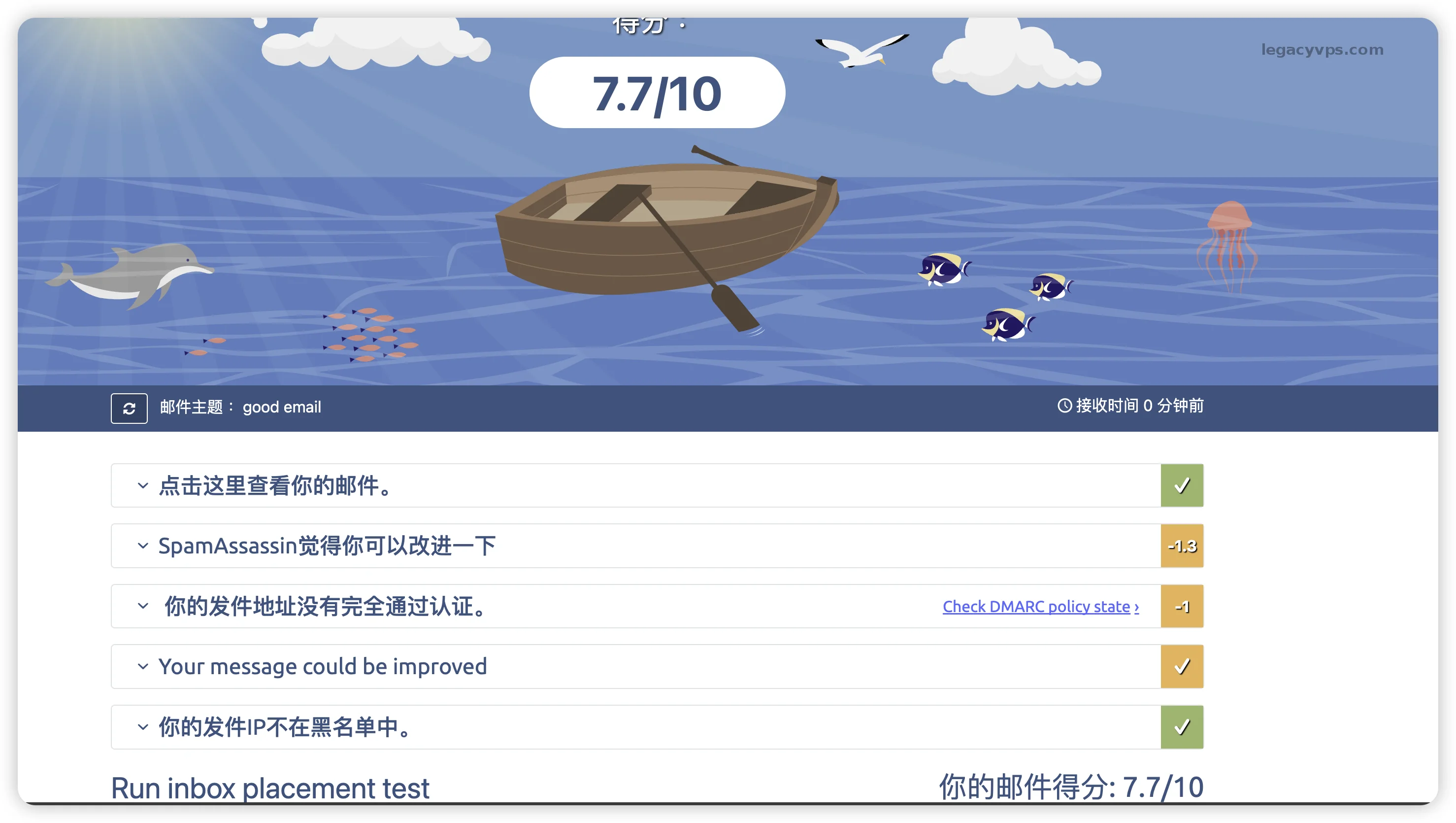 目标是 10/10 分。如果分数低,它会详细列出是 DKIM 错误、SPF 错误还是缺少 PTR 记录。我这里显示只有7.7分是因为rDNS我没有去修改绑定,还有一些必要的DNS记录没有添加。因为每一个IDC厂家的rDNS修改法都不一样,所以我没有具有的记录操作。