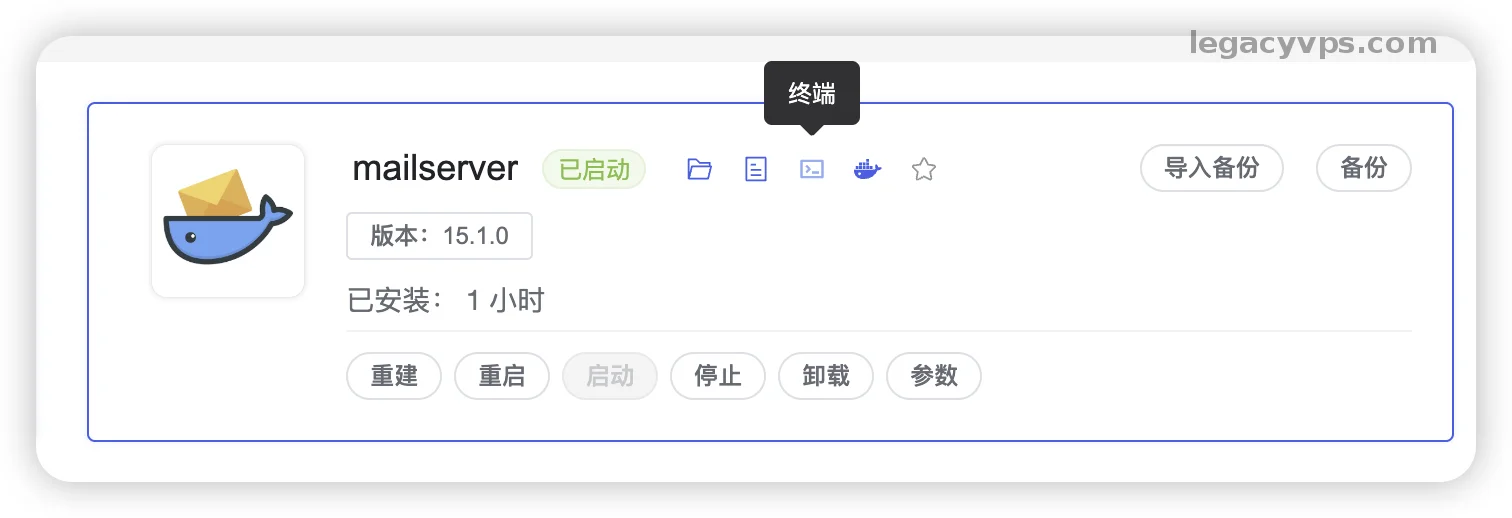 点击 1Panel 侧边栏 容器,找到 mailserver 容器,点击右侧的 终端 图标进入容器命令行。