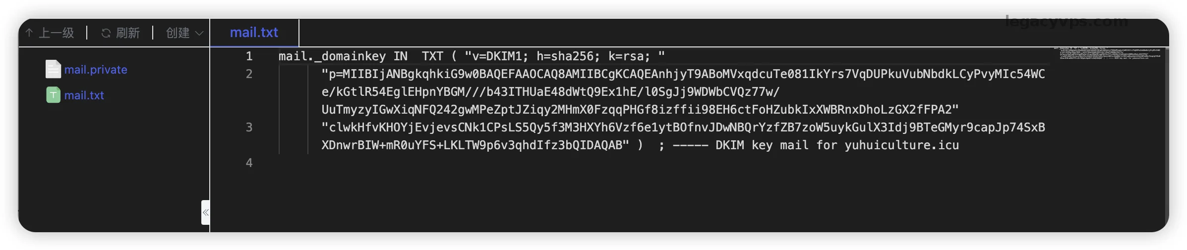 打开刚才生成的 mail.txt 文件。 手动添加 DNS 记录时注意:需合并文件内的记录值,去掉双引号和换行符,将其合并成一行长字符串。