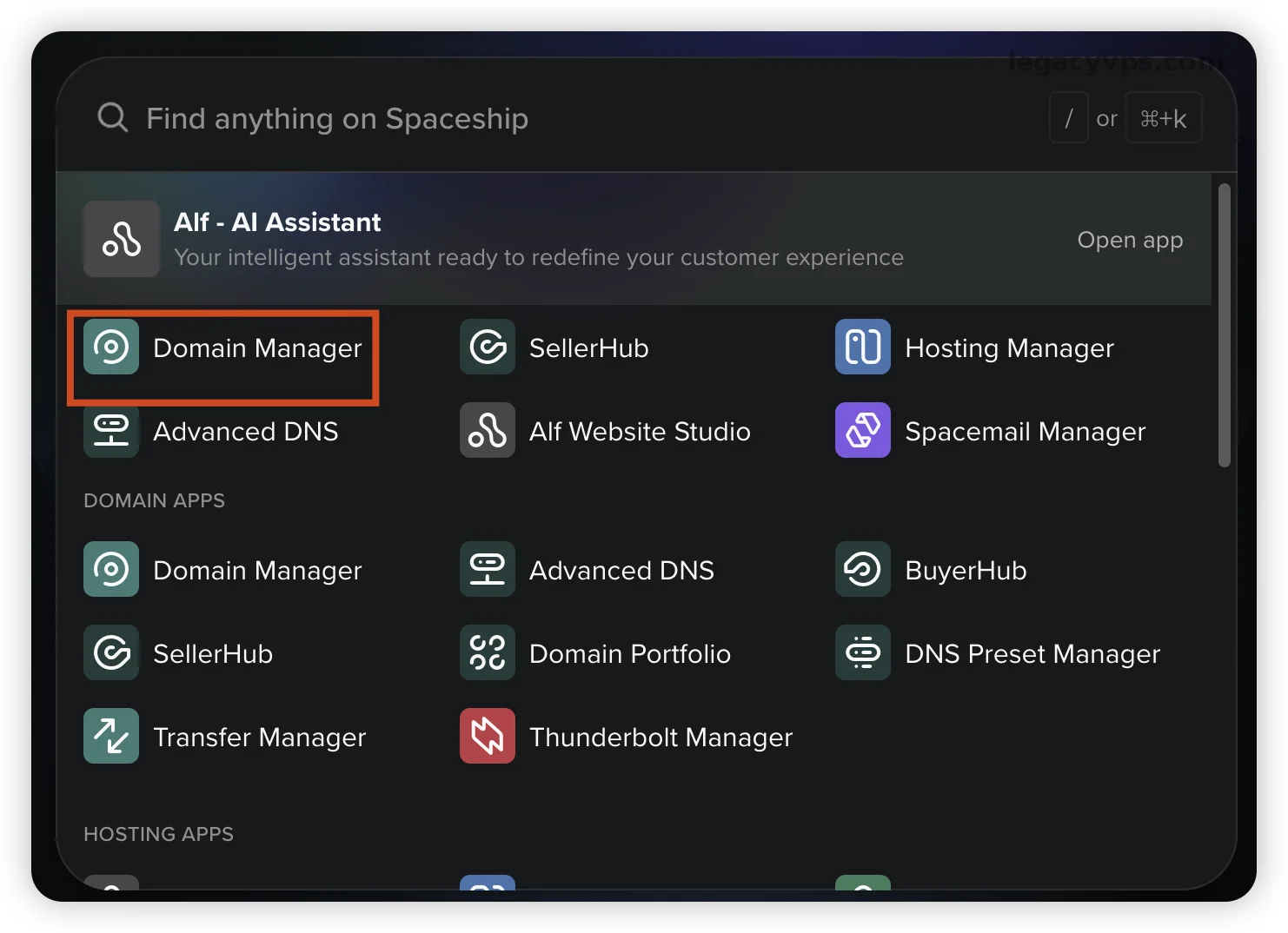 1. 进入域名管理器 登入Spaceship 找到 [ Domain Manager ],这里是管理域名的地方,可能你的是中文不一定一样。
