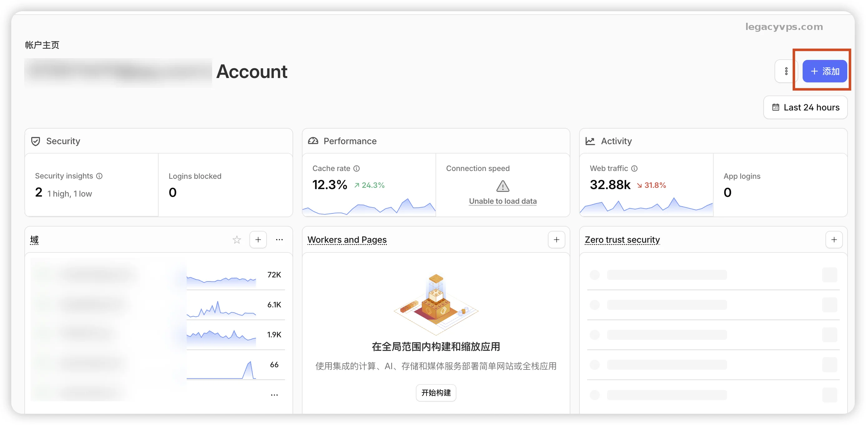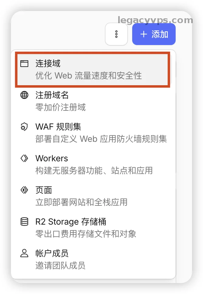 1. 添加域名 打开 Cloudflare 后台,在账户主页右上角,找到那 [ 添加 ] 按钮。然后再弹出的菜单里选择 [ 连接域 ],就这么简单两部。