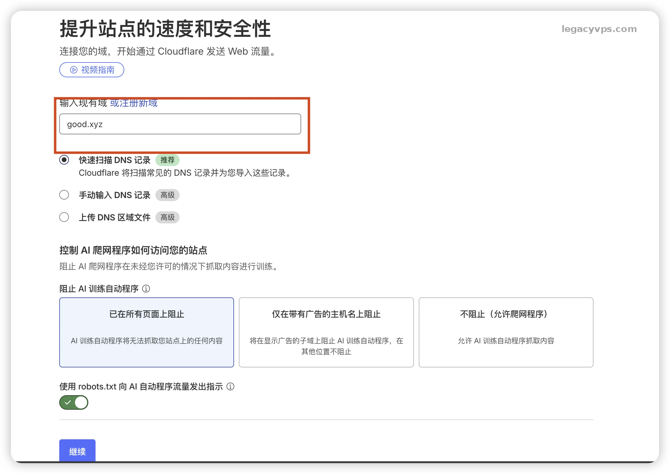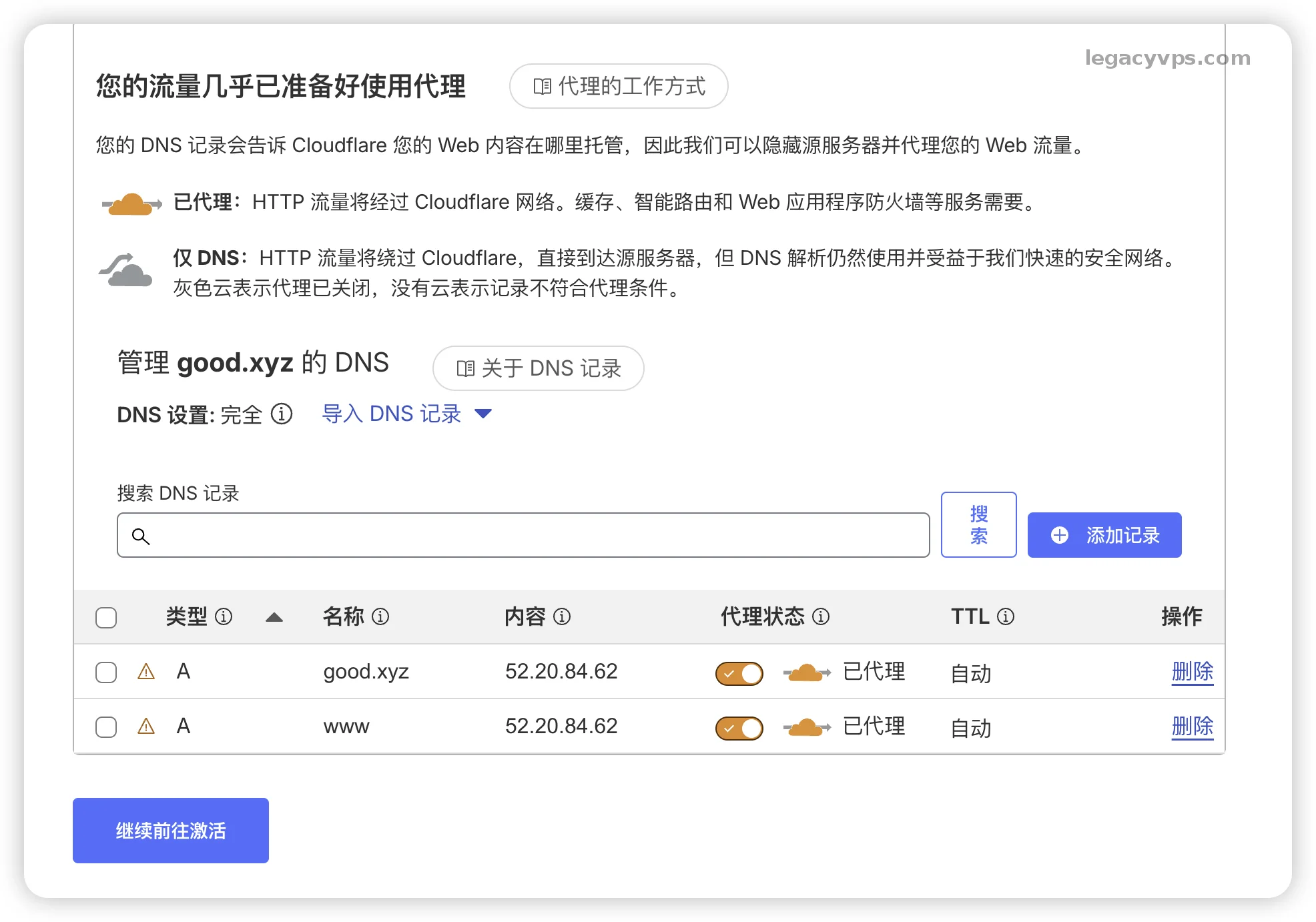 4. 检查 DNS 记录 这里有一个点要注意,CF托管域名的时候会自动扫描你域名现有的 DNS 记录。直接点第一个方式就好了,会把旧的DNS记录继承过了,就可以无缝的在CloudFlare上托管域名不需要修改其他的内容了。