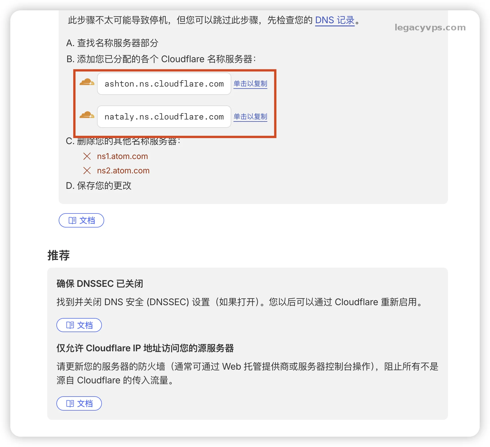 5. 获取NS记录 (最主要的一部) 这一步是这里面最重要的一步。CF 会给你分配两个专用的名称服务器地址(比如图中的 ashton.ns.cloudflare.com 和 nataly.ns.cloudflare.com),这里只是做演示,每个域名分配的NS记录都不一定一样所以以实际为准。 把这两个NS记录复制下来,网页也先别关。