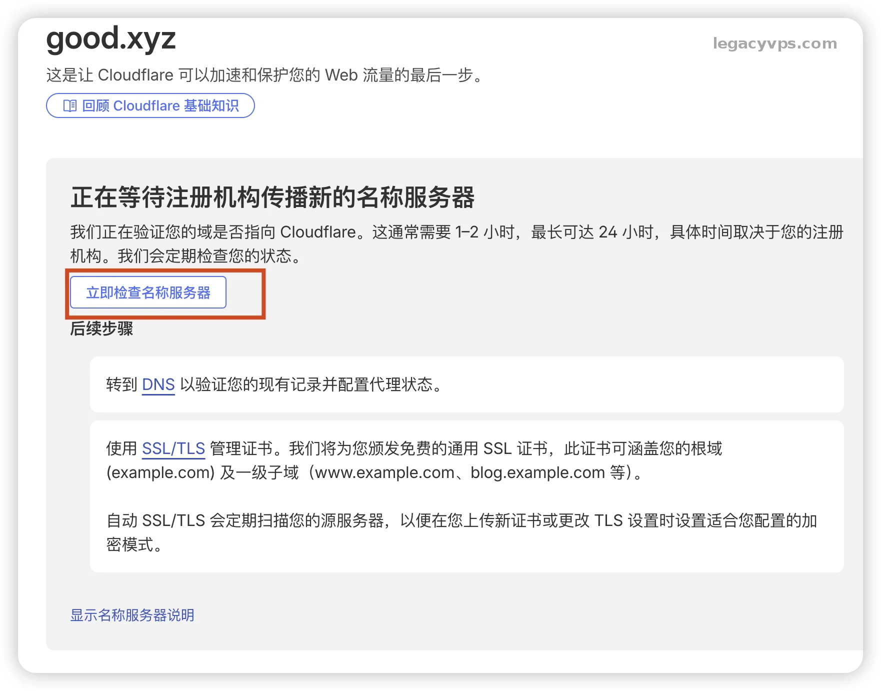 如果等不及可以点击CloudFlare页面的 [ 立即检查名称服务器 ] 按钮,不过短时间只能点击一次,最好的就是别管他等待邮件,成功托管CloudFlare会发送一封邮件给你。